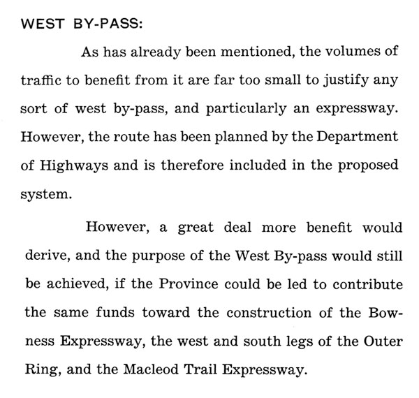 In reviewing the full text of the transportation plan, some interesting information was suggested about the origin of this road. The Sarcee Trail, or West By-Pass as it was known then, was included by the City of Calgary in the 1959 plan reluctantly. It was noted that “there is an insignificant amount of demand for by-pass routes around the city, to serve traffic moving from one provincial highway to another… Nevertheless, since a by-pass to the west and south of the city has already been firmly planned by the (Alberta) Department of Highways, it has been included in the proposed system.”
