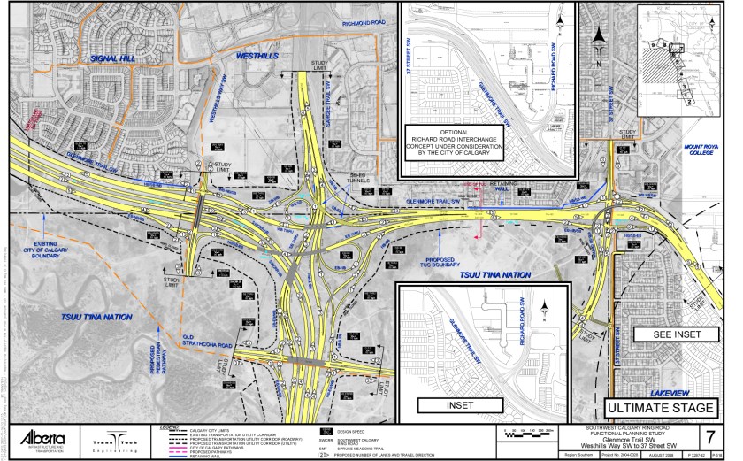 Westhills/Sarcee Trail/37th Street SW. This section includes several interchanges that were requested by the Tsuu T’ina, including an interchange for direct access to Westhills and the on-reserve interchange with Old Strathcona Road. The plans here also include the seemingly unrelated interchange of Glenmore Trail and 37th street SW, included to facilitate widening of Glenmore Trail, and for access to the Tsuu T’ina reserve. Access to Lakeview has been radically re-worked through ‘former’ reserve land, as 37th street SW from the community is cut off from Glenmore Trail.