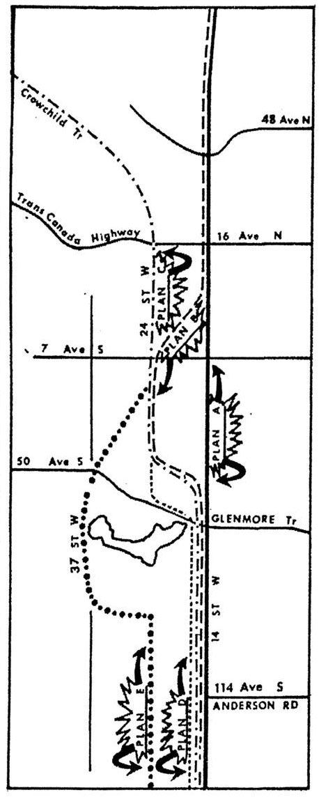 In 1956 (above) plans were drawn up to make the areas of what would eventually become Lakeview and the community of North Glenmore Park into a huge, 2000 acre park, complete with aquarium, solarium, botanical garden and museum. The West Bypass road, was shown as running along 37th street SW and crossing the Elbow river (a few hundred feet west of the Weaselhead bridge and Priddis trail) to connect with 90th avenue SW south of the reservoir. Though the park plan was accepted in principle by City Council, the road plan would not be ratified until 1959, by which time the bypass road had been moved.