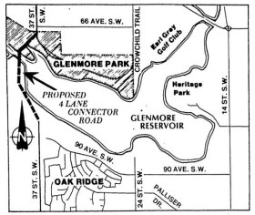 As an extension of these plans, in 1971, Ward 13 Alderman Roy Farran instead proposed linking 37th street SW north and south of the reservoir, this time as a minor 2-lane road through the parks, crossing the Elbow river at the site of the original Weaselhead Bridge. This was again rejected.