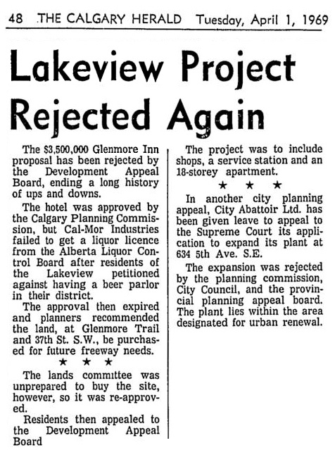 In 1969 the City of Calgary administration recommended the purchase of the failed Hotel site in order to protect it for Glenmore widening, expected in the 1970s. The city’s Land Committee did not exercise this option, and much of the land was later developed into apartments.