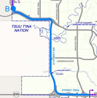 In 2002, the City began the process of looking at alternatives to a Tsuu T’ina road route by adding two other routes to be studied; 37th street and Crowchild Trail crossing the reservoir (above upper).