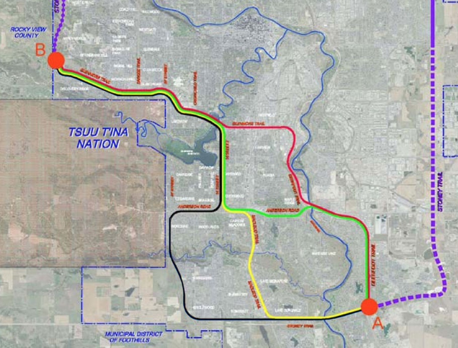 In 2009, five years of planning and negotiating for a ring road in Southwest Calgary was voted down by the members of the Tsuu T’ina (more here). When the province walked away from further discussions, they declared the Tsuu T’ina option dead and were anxious to move on; to develop another option entirely within the city of Calgary. This would be called the ‘Plan B’.