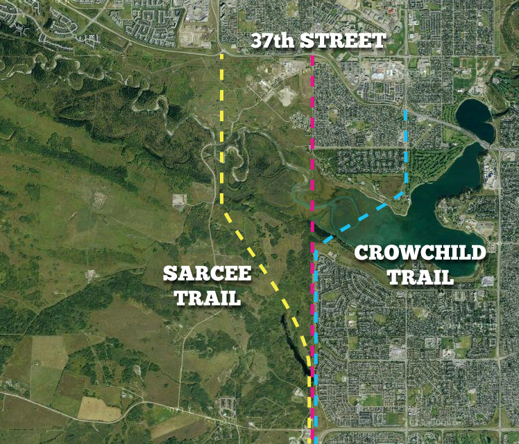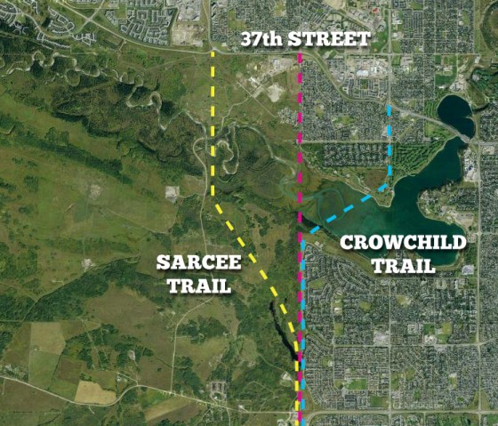 Every transportation plan since 1959 planned for an extension of Sarcee Trail to become the primary north-south freeway on the west side of Calgary (essentially the ‘Plan A’). Though there have been a few alternatives proposed throughout the years, mainly involving on 37th street SW, these concepts had never been fully explored, and none have ever been approved (you can see these preliminary concepts here).