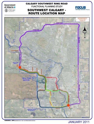 The Plan B study, officially part of the ‘Calgary Southwest Ring Road Functional Planning Study’ was prepared for the province by Focus Engineering. In it, five potential routes for a southwest ring road were presented, along with an overview of the issues involved including the need for a road, future traffic patterns, design standards, location and construction techniques.