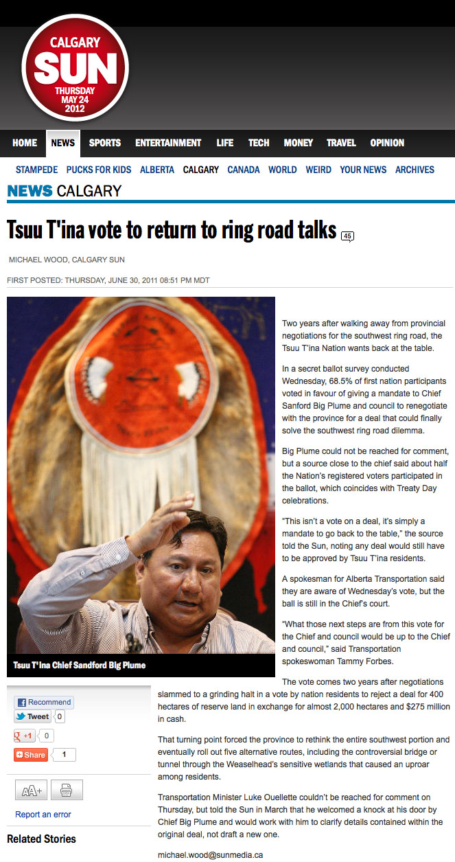 The Province welcomed renewed talks about the ring road, and within two weeks of the Tsuu T’ina vote talks had been renewed. Premier Stelmach says that a Tsuu T’ina route would give them a wider right-of-way, greater traffic flow, would provide for a ‘safer’ road, ‘without disturbing our communities’. The Province stated that while the route and compensation from the 2009 deal would remain intact, they would rewrite portions of the agreement to address the concerns the Tsuu T’ina had with the wording, specifically in regards to agreeing to guarantee the land swap in the deal (more on the original deal here).