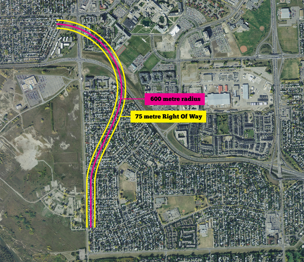 Of course those rough numbers, in the 230+ region, only takes into account a straight-line corridor for a road. It ignores one important and land-hungry piece of infrastructure: an interchange needed to merge three major roadways (Glenmore Trail, the ring road and 37th street), and the turning radius required for making the 90-degree turn from the Glenmore Trail corridor to the 37th street corridor.