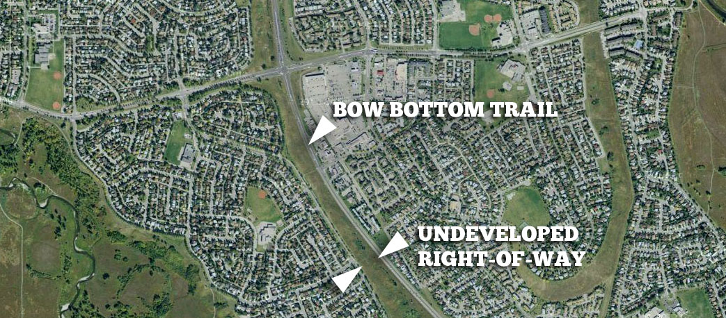 The original plan for the Deerfoot Trail had the road continue south from Anderson Road, via the corridor now occupied by Bow Bottom Trail, over Fish Creek and connecting to Highway 22x just east of Sundance. However, in the 1970s there was dissatisfaction with routing the Deerfoot Trail through the newly-formed Fish Creek Provincial Park, including by the Provincial government, and the routing was changed. Alberta Premier Peter Lougheed stated “We think the park would be hurt by the road going through it. I think there are five or six good alternative routes where the road could go around it.” This resulted in the Deerfoot being moved further East, through what is now the McKenzie communities. In fact, you can still see evidence of the original alignment. The right-of-way through which Bow Bottom Trail travels is abnormally wide for a road of its size, and is in fact the original right of way for Deerfoot Trail