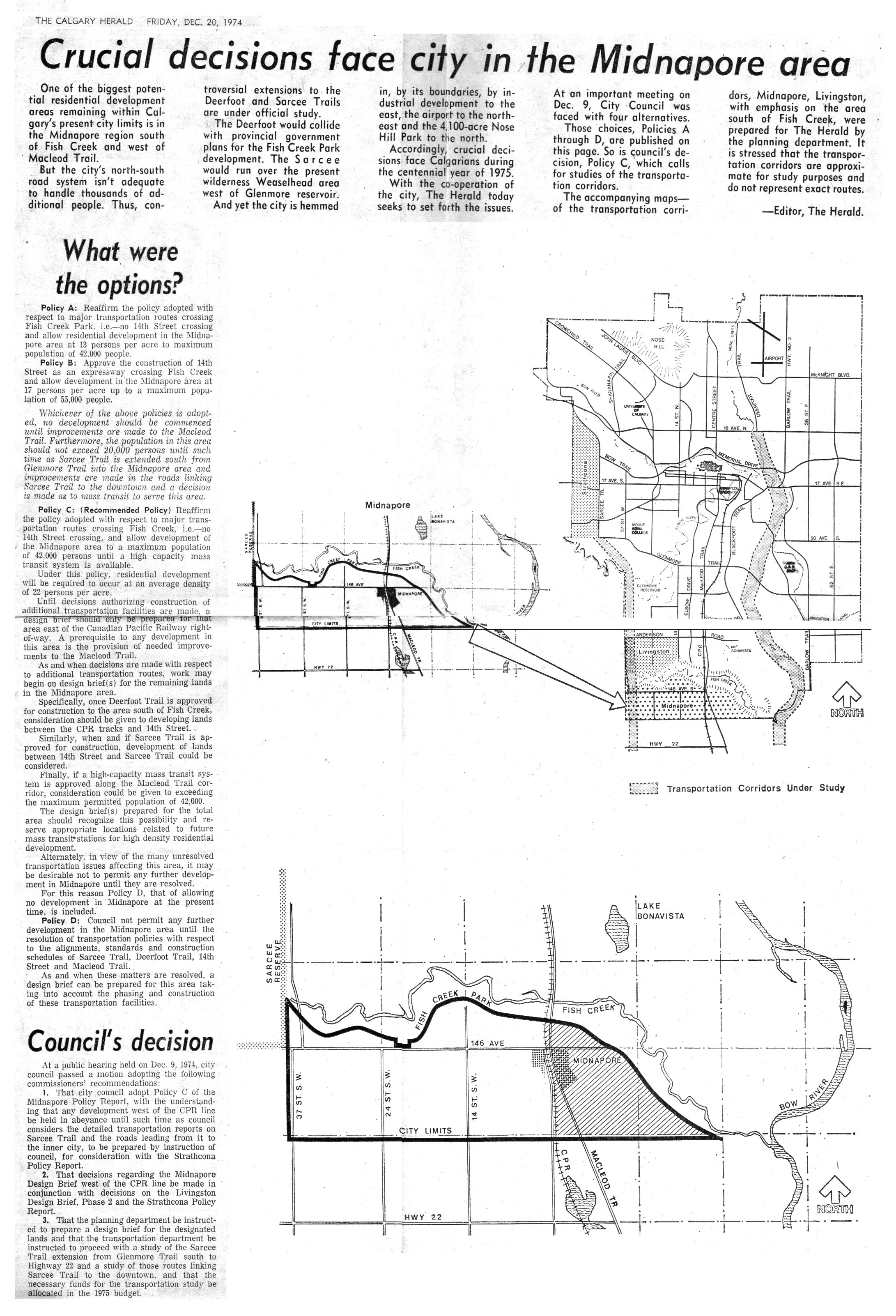 - Futher to the geographic divisions, the 1974 decision placed a maximum population of 42,000 for the entire Midnapore area, to be expanded only when the LRT was extended south of the Fish Creek.