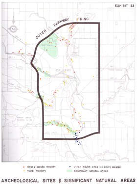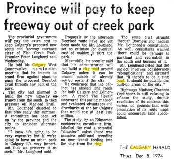Alberta Premier Peter Lougheed was concerned enough about the impacts of the road that he pledged to ‘do what he can to prevent implementation’ of this ring road plan (as reported by the Calgary Herald), and that his administration would not build a ring road around Calgary unless it can be placed outside of already settled parts of the city. Lougheed stated “If there’s to be a ring road, it should be outside the built-up areas of the city.” At the same time, the Premier was also fighting to keep another major road out of the city’s natural areas. In speaking about re-routing the planned Deerfoot Trail away from Fish Creek Park he said “I know it’s going to be very expensive but if we are going to have an urban park in Calgary it’s very important that we preserve it as such”. (More on the relocation of Deerfoot Trail around Fish Creek Park here)