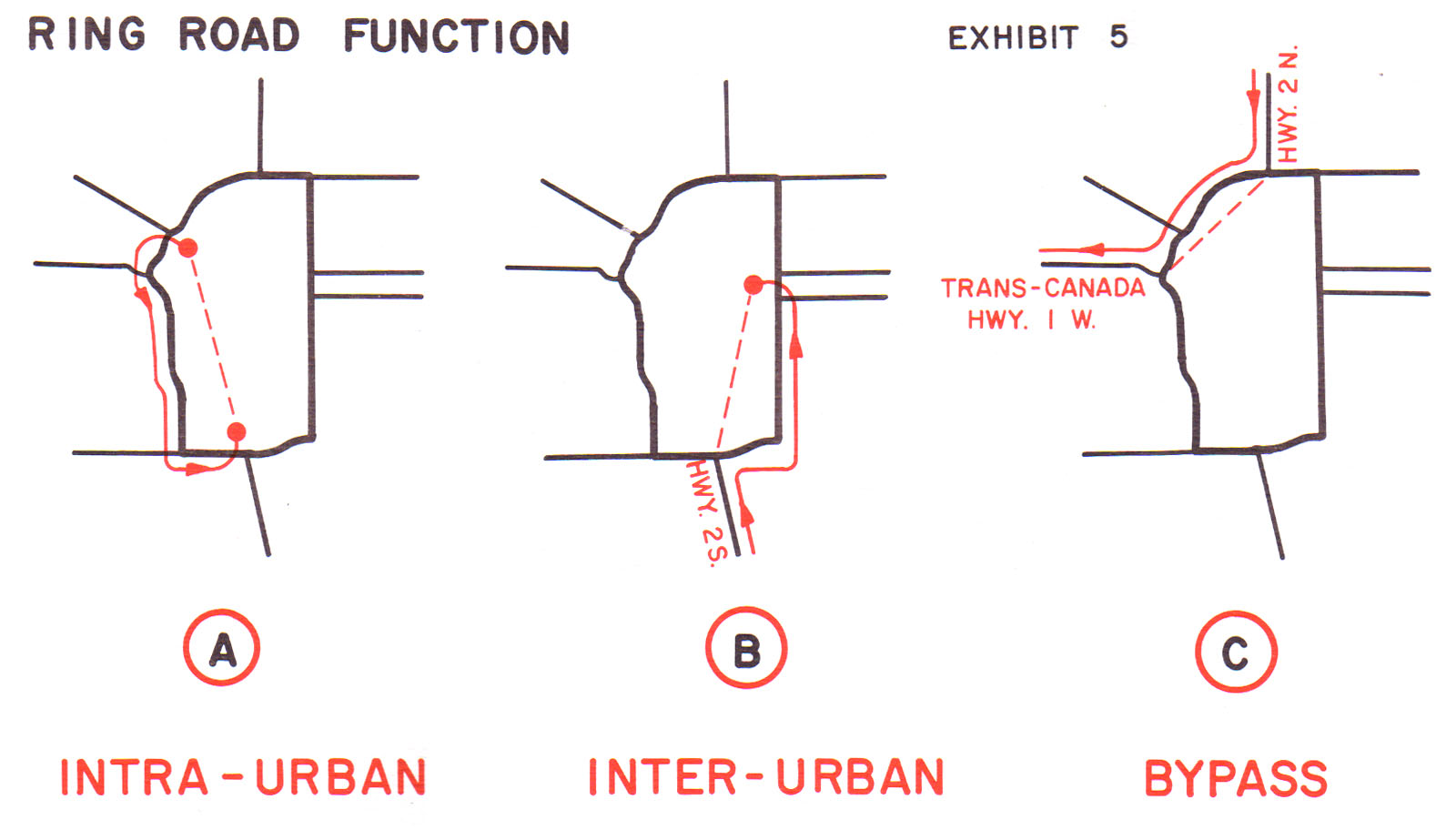 Despite being planned as a ring road, the road’s use as a bypass of the city was noted to be strictly limited. The report notes that “the function of the ring road for bypass trips will not be significant” and the distance from 16th avenue means it “cannot be considered as a bypass route for Trans Canada traffic”. Instead, the primary function of the road was to service intra-urban trips; journeys that both start and end within the city. This is because, according to the report, “nearly all of the Metropolitain Region population lies within the proposed corridor as well as major industrial and commercial development. Representative intra-urban trips would be by people living within the City and working and/or shopping within the city.” To that end, the road would be successful if it could integrate into the overall transportation system of the city, and encourage traffic away from the inner city arterial roads.