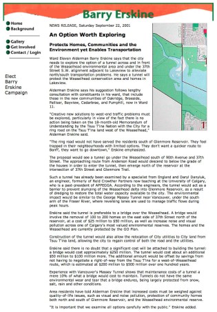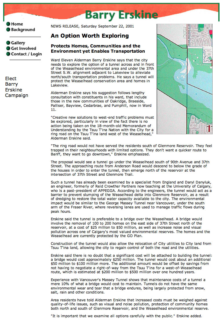 Ward 11 Alderman Barry Erskine ran for re-election that year with the tunneling of the Sarcee Trail extension on City land as a prime platform. Alderman Erskine’s ward included the Weaselhead, as well as the nearby communities of Lakeview and Oakridge. In his campaign, Erskine touted a tunneled option for the road as a way of fulfilling commuting needs of the south, while at the same time protecting the Weaselhead and homes in Lakeview.