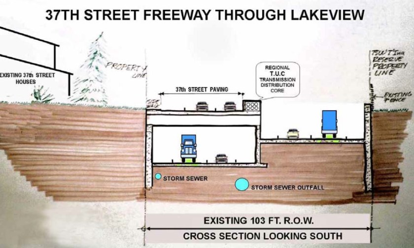 1) Ring road/bypass traffic uses a tunnel below the existing 37th street SW in Lakeview (Yellow, also see cross section below)