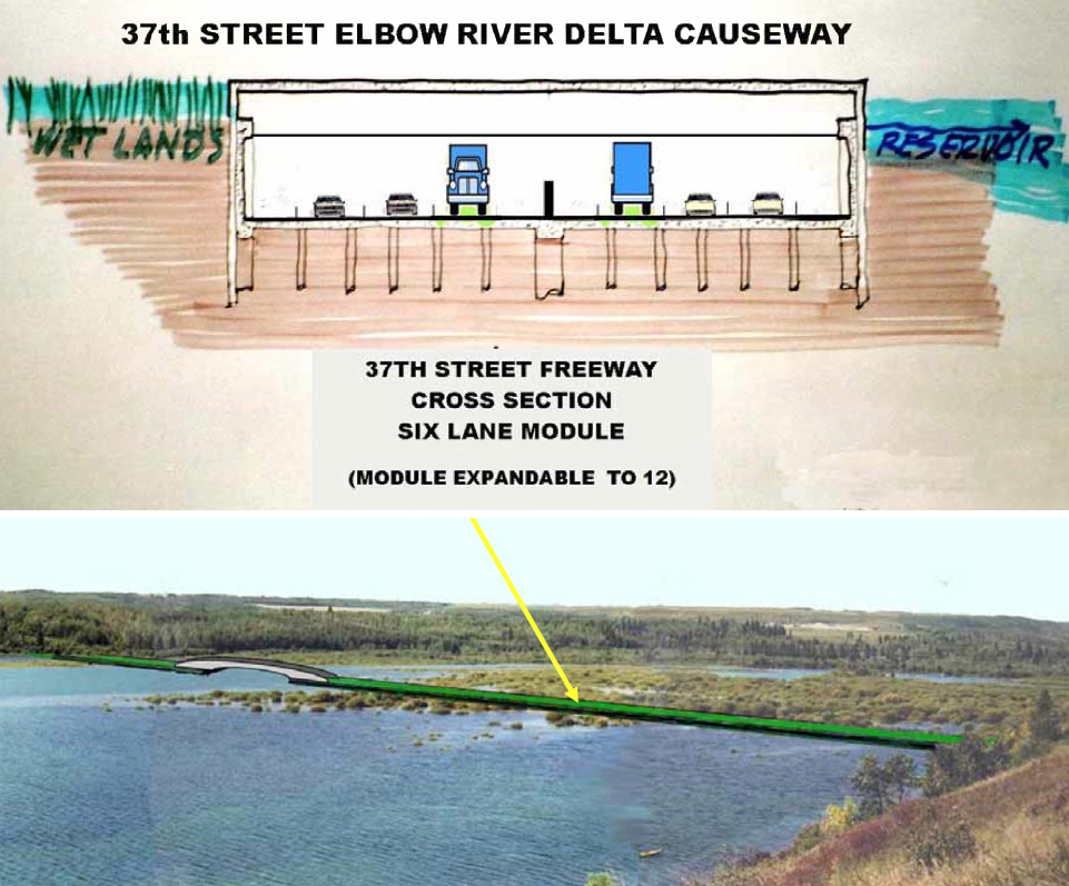 The proposal was a multi-leg tunnel which would cross the Elbow river along the 37th street alignment from the South, but then split traffic into different tunnels according to their destinations: