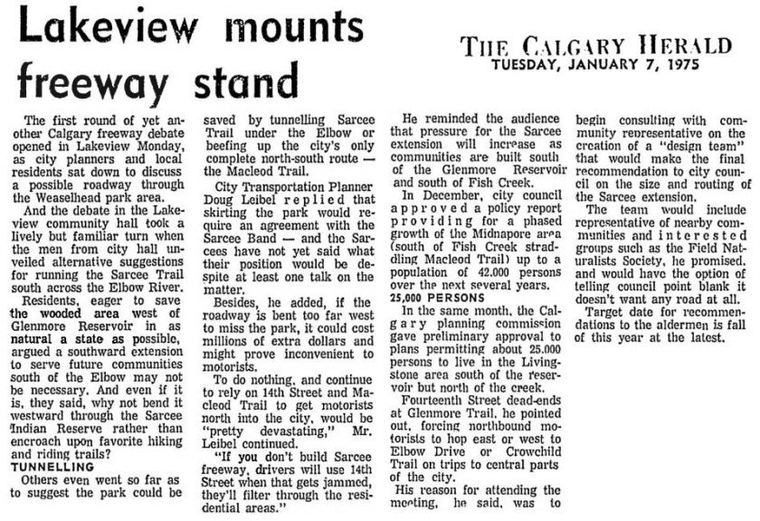 In 1975 the Lakeview Community Association hosted a public information session by the City of Calgary to discuss preliminary options for a Sarcee Trail extension in the Weaselhead area. A study of the extension was mandated in 1974 as a condition of development in the Midnapore area (More on Midnapore here). That mandate started the process of studying route options for the road, and resulted in the 1977 publication of the Sarcee Trail South Route Location Study. The process also had a public input component that required public meetings and the formation of a citizens advisory board that included area residents (More on the 1977 study here).
