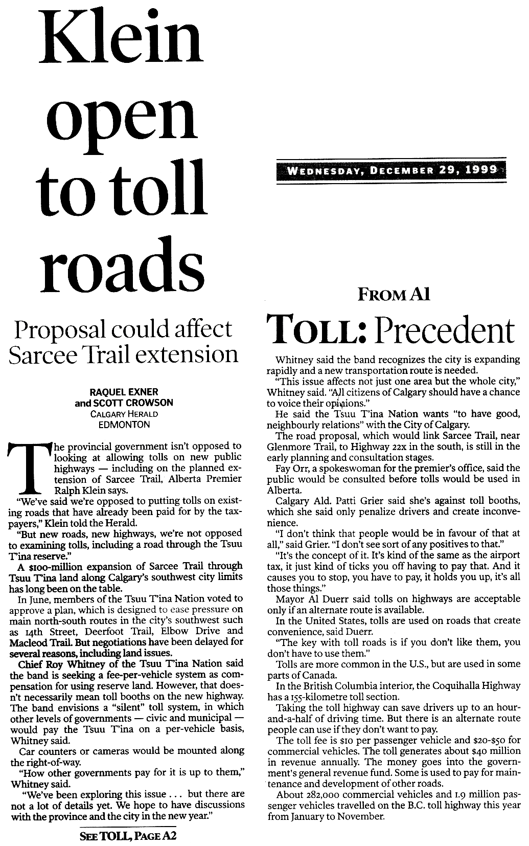 Interestingly, Ric McIver may actually have been the first person to publicly float the idea of a toll road on the southwest portion of the ring road. On October 13 1998, the Calgary Herald reports that while running for Ward 12 Alderman, McIver stated “If the province cannot or will not provide funding, we should build it anyway now… we need to get together a private-public partnership to build it as a toll road on a 20- to 25-year payback basis.”. The idea was for a traditional toll road as limited-time implementation to cover construction costs, rather than as an ongoing method of paying for a land lease.