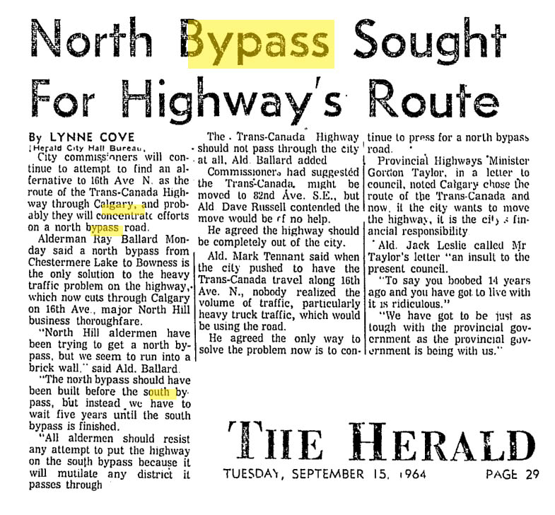 In 1964, despite having agreed to the location of the Trans-Canada highway on 16th avenue only 14 years earlier, the City wanted to look at alternative routes. 16th avenue had seen a steady increase in traffic since becoming the Trans-Canada route, and alternatives, including a new route north of the city, were sought to relieve the congestion.