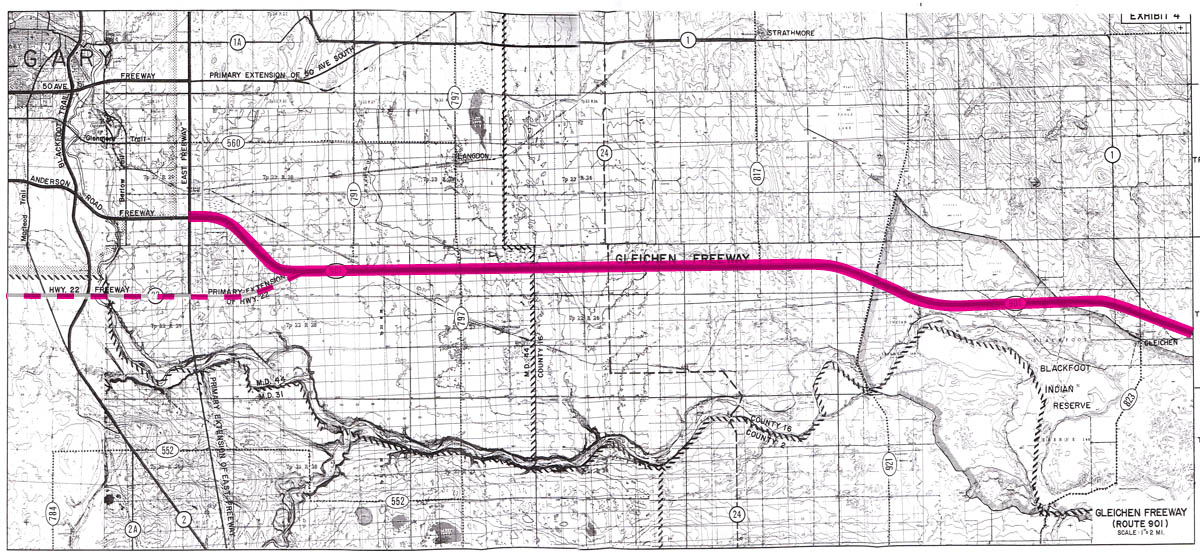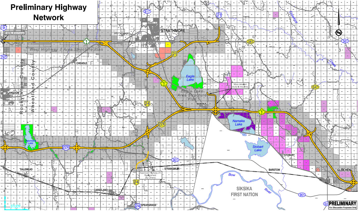 An interesting plan the currently exists is that the province wants to twin Hwy 560 (Glenmore Trail) between Calgary and Langdon and convert into a freeway(http://www.transportation.alberta.ca/projects/calgary.aspx & http://www.transportation.alberta.ca/projects/assets/Area_7_Calgary_Area/Hwy_560/Recomended_plan.pdf). If there was ever an extension of this freeway so it connects with Hwy 1 west of Strathmore, it could produce a free-flow alternative for Hwy 1 through Calgary via an upgraded Glenmore Trail & Sarcee Trail and bypass the Siksika First Nation, unlike the Hwy 901/22X plan.