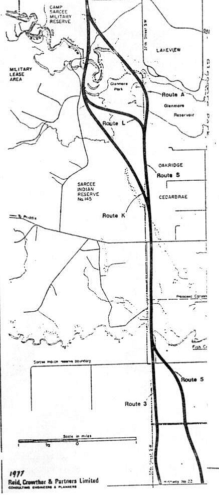 The proposed Provincial route for the road through the Weaselhead had begun to cause concern among local residents and naturalists, citing environmental impacts and diminished recreational enjoyment that the area would sustain should a freeway be located through the park. By the mid 1970s the City had committed to undertake detailed study for the location of the West Bypass, known by this time as the Sarcee Trail Extension, and the study began with five route alternatives under consideration.