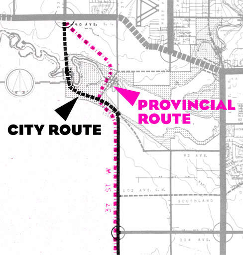 On the eve of 1959 there were actually two routes for the West Bypass under consideration: The City route which was ultimately included in the approved transportation plan, and the Provincial route, which was similar but different in significant ways. The City route continued Sarcee Trail due south from Glenmore Trail, then hugged the western and southern border of the Weaselhead on its way towards 90th avenue SW south of the reservoir. The Provincial route (shown in pink below) differed in that it headed directly southeast from the junction of Sarcee Trail and Glenmore Trail, and crossed the Weaselhead much closer to the reservoir. While the Provincial route was not originally adopted in the City’s plans in 1959, by 1963 this alignment formed the basis of the intended route, and continued to do so for many years.