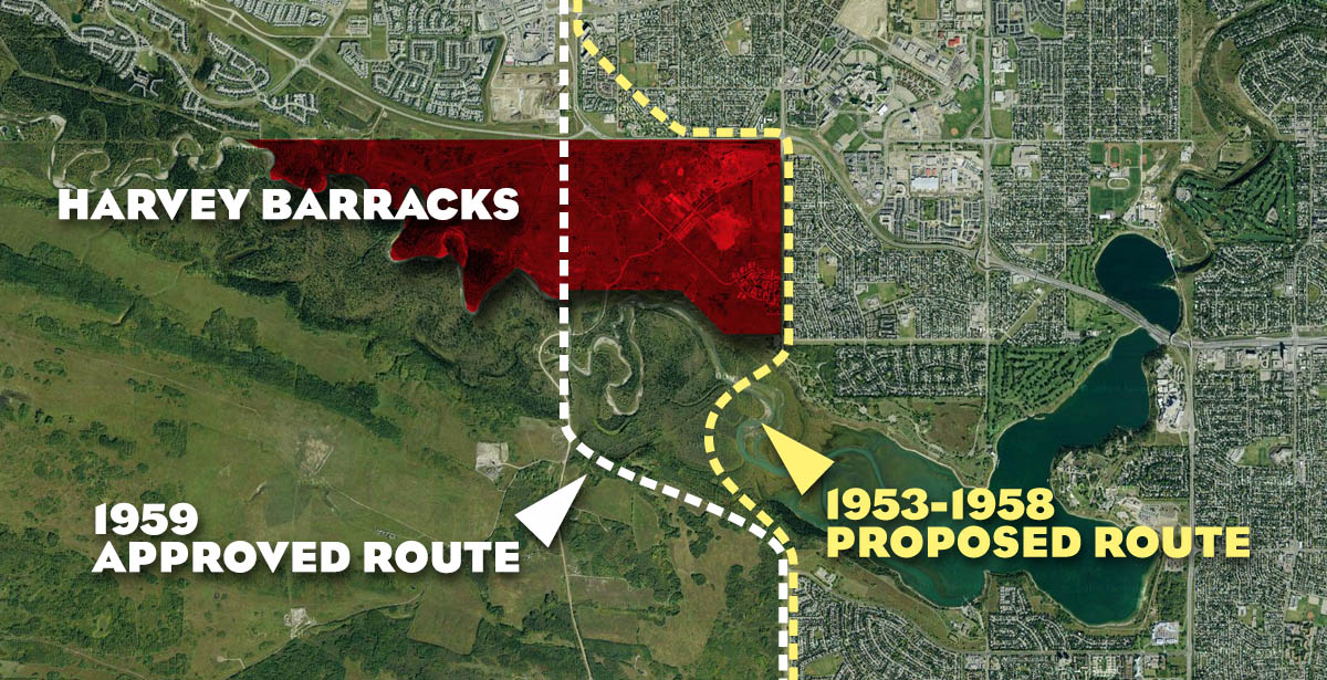 In November 1958, City Planner J. H. Eassie and Commissioner E. C. Thomas proposed a new alignment for the southwest portion of the Outer Ring Road, now called the West Bypass. The new alignment differed from the previous proposals by avoiding the future communities of Lakeview and Glamorgan altogether, and instead ran around the western edge of the Weaselhead and through the Harvey Barracks lands (shown in white above). This route, travelling through the Weaselhead and the Harvey Barracks, did not require any land from the Tsuut’ina, as it was located within what was then the city-limits. The route was approved by the City Thoroughfare Committee at its November 24 1958 meeting, and would eventually be ratified by City Council as part of the 1959 Calgary Metropolitan Area Transportation Plan, the first comprehensive transportation plan to be adopted by the City. The decision to plan the ring road through the Harvey Barracks land would prove to be a pivotal moment in the history of this road.