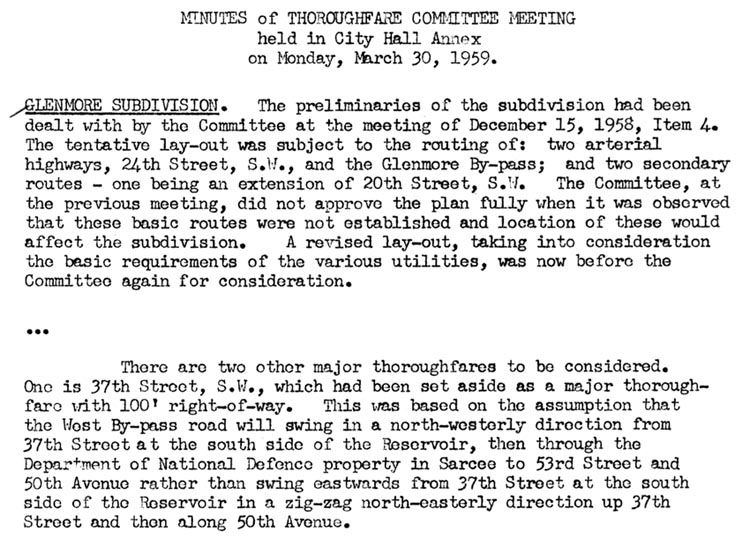 Within a few months, the design and planning of the communities of Lakeview and Glamorgan was underway. With the new routing of the West Bypass approved in principle, City planners chose to dedicate 37th street SW in Lakeview as a ‘major thoroughfare’ rather than as higher-capacity facility. The layouts of Lakeview and Glamorgan were explicitly designed on the understanding that the Outer Ring Road would skirt the Weaselhead and traverse the Harvey Barracks, and not pass through either of these new communities. An extract of the March 30 1959 minutes of the Thoroughfare Committee Meeting discussing the roads through Lakeview is shown below.