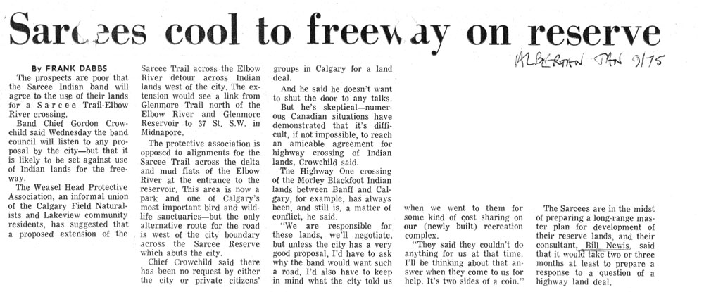 At least two of the five initial routes presented by the City in 1975 in preparation for the Sarcee Trail study traversed a portion of the reserve, and these would be joined by others like Routes K and L. The inclusion of Tsuut’ina-based routes would appear to have been optimistic, as very early on in the study process the Nation had publicly noted that a deal for reserve land may never happen. In an interview in January of 1975, only 2 days after the Lakeview information session, Tsuut’ina Chief Gordon Crowchild said that while the band council would be willing to listen to a proposal, they would not be likely to sell the land required for the road.