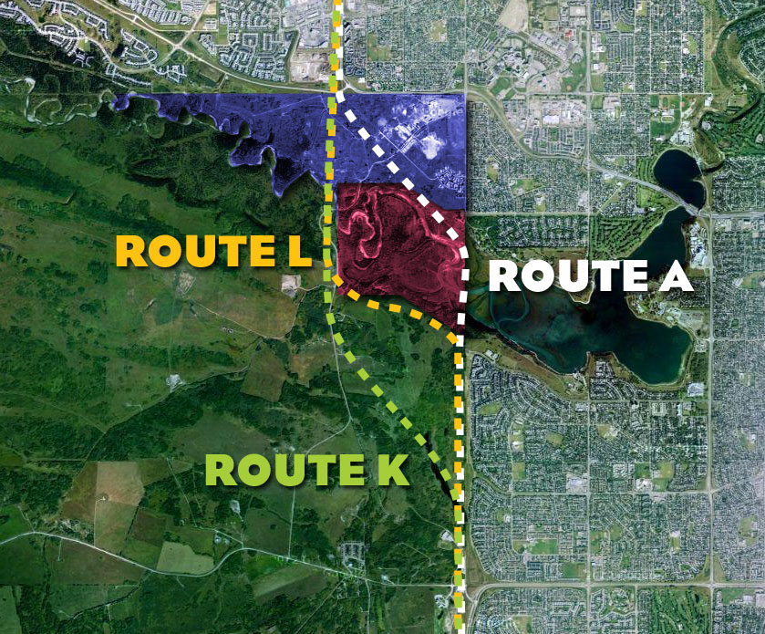 Route A would have traversed the east side of the Weaselhead via a low-level causeway and was contained entirely within the city limits of the time, while Routes K and L were located partially on land in the reserve. The location of these two routes would create a difficulty for the study: the availability of reserve land and other data from the Nation had not been collected or definitively assessed in the course of the study, and further information would be required in order to recommend a final route.