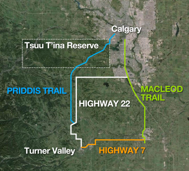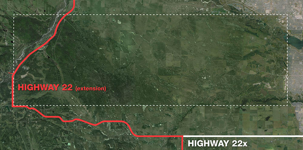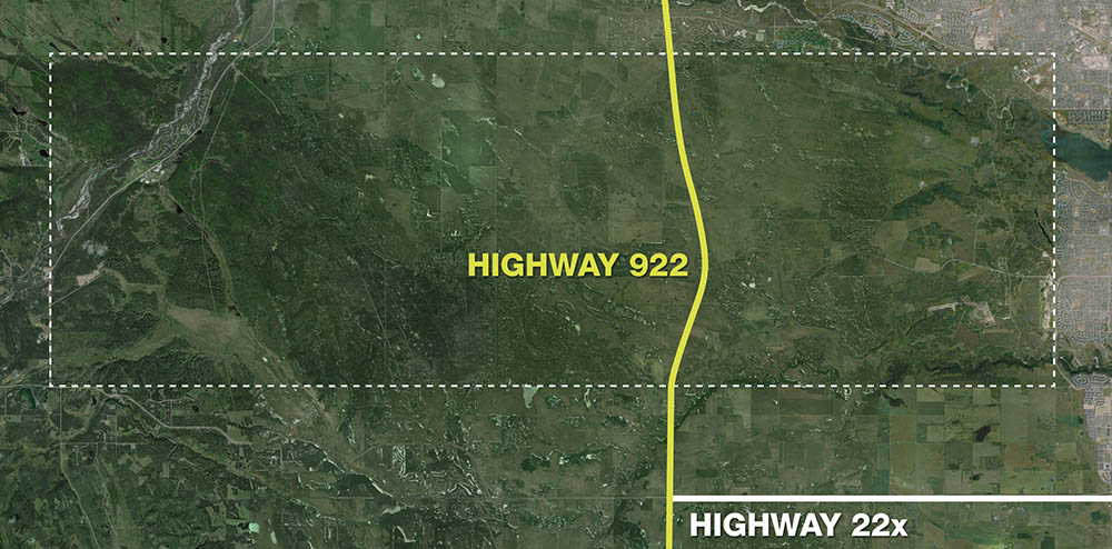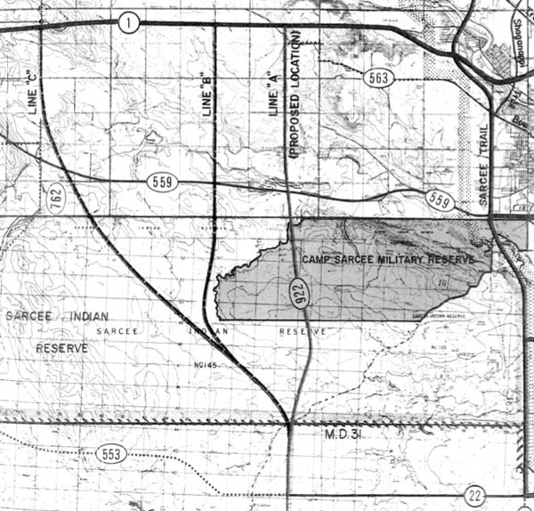 In 1965 the Province began a program of ‘rural road studies’ that would plan for future local road and highway needs throughout the province. This resulted in a series of Secondary Road Study Reports, including several that focused on the Calgary area including the Municipal Districts of Rocky View and Foothills. These reports, along with the ‘Calgary Area Study’ undertaken in 1970, identified the need for a new North-South highway west of Calgary. The Study detailed three potential routes for this road, then known as Highway 922, and recommended one as a potential extension of Highway 22. This road would have continued Highway 22 north from Priddis, bisecting the reserve through it’s centre, and connecting with Highway 559 (now Highway 8) and the Trans Canada Highway.