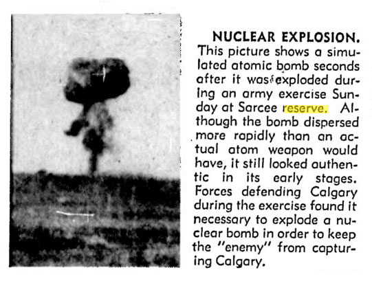 Traditional ‘war games’ were held on the artillery range for decades and new elements were added and updated in response to real-world military developments. In 1957 the Military wrapped up a 2-day large-scale exercise on the Sarcee artillery range with a new element; a mock atomic bomb explosion. The blast (documented below) was the result of an explosive device reportedly containing “jellified gasoline, acid and 40 to 50 pounds of TNT” being detonated on the reserve. The explosion’s fireball and mushroom cloud rose 500 feet in the air and was visible from central Calgary. The use of a mock atomic blast on the Tsuu T’ina reserve, which resulted in a 12 foot-wide crater, was not to be a unique event; the military also kicked off it’s 1963-1964 season of training with another simulated nuclear explosion.