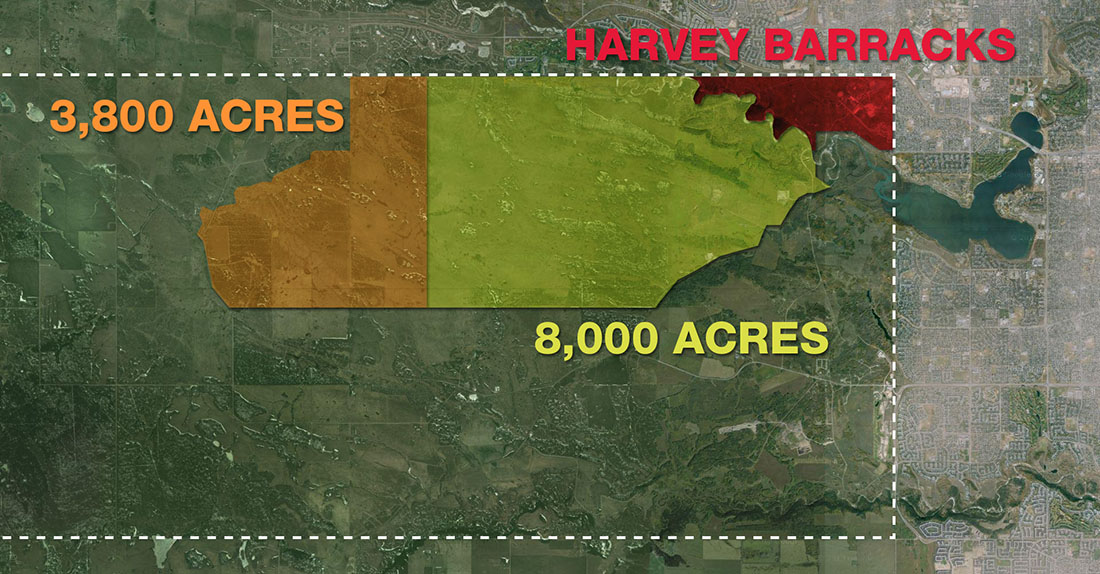 In 1910 the Canadian Military officially used a portion of the Tsuu T’ina reserve for a few days of summer maneuvers for the first time, and in 1915 a permanent camp was established on the north east corner of the reserve, which would soon become the largest military camp in western Canada for training soldiers for World War I. This triangular piece of land, then called Sarcee Camp and later known as Sarcee Barracks, Harvey Barracks and ‘The 940’, is defined by Glenmore Trail to the north, 37th street SW to the east and the Elbow river to the southwest. The area was leased until 1952 when the Department of National Defence purchased the land outright from the Nation. (See the map below). For more information about this land, click here.