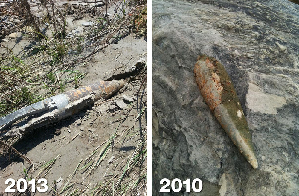In July of 2013, following the flooding of southern Alberta, two unexploded ordnances were spotted on the banks of the Elbow river in the Weaselhead area within the City of Calgary. Discovered two weeks apart by different hikers in the area, the munitions were brought to the attention of the Calgary Police, who detonated them where they were found. The detonation of the first shell was carried out while the as-yet-undiscovered second shell lay less than 10 metres away, and while the second shell was not disturbed by the initial detonation, the incident served to highlight the lingering danger of unexploded ordnance in the area and of the importance of proper clearance and disposal.