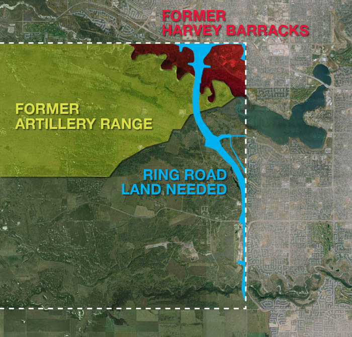 The 2009 plans for the ring road would have seen the road traverse the former Harvey Barracks and artillery range, and the construction of the road and interchanges would necessitate digging in lands once used for military training. In the years following the signing of the Framework Agreement with the Tsuu T’ina Nation in 2005, the Province engaged several companies to begin to assess the risk of unexploded ordnances along the ring road route. Consulting engineering firm Amec was hired to assist the Department of National Defence by creating a risk management framework, and was informed by information gathered from historic land-clearance data and a ‘targeted field investigation program’. Airborne geophysical surveys along the ring road route were also undertaken to assess the risks posed by unexploded ordnance.