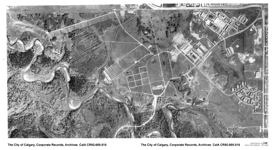 (The Harvey Barracks shown approximately 1973. Image composite of CalA CR92-005-510 and CalA CR92-005-516 courtesy of The City of Calgary, Corporate Records, Archives)
