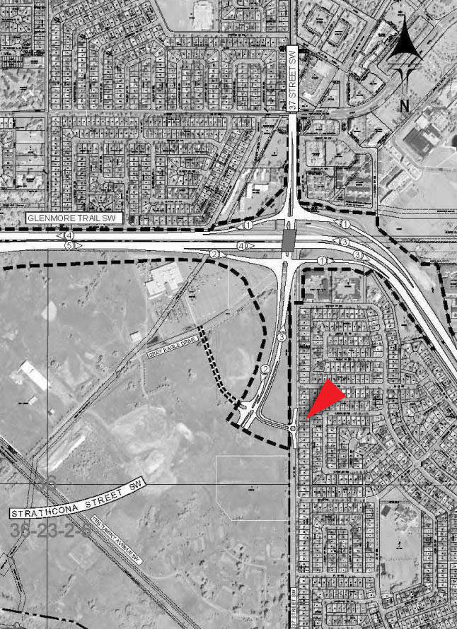 Access will no longer be provided directly from the 37th street SW and Glenmore Trail interchange, but will occur at a new roundabout located on 37th street SW between 54th and 58th avenues SW. This entrance is fed from the new Strathcona street on lands that are currently in the Tsuut’ina reserve.