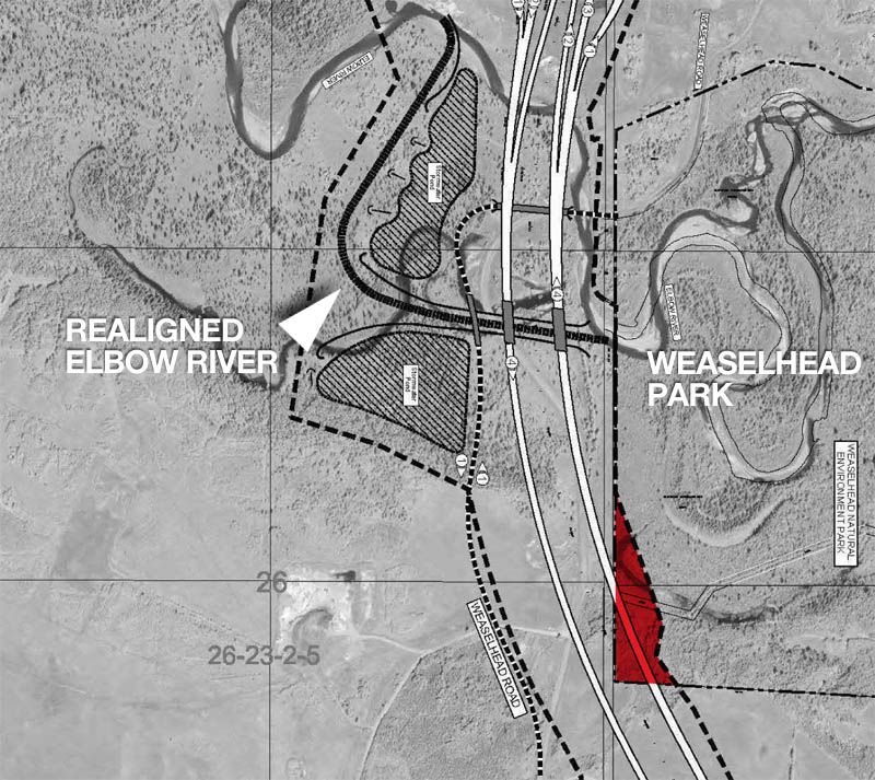 In addition, the Elbow River and Fish Creek would be realigned to the west and under the ring road crossing (the Elbow realignment shown in black above), and portions of the riverbanks would potentially be ‘stabilized’ on each waterway.