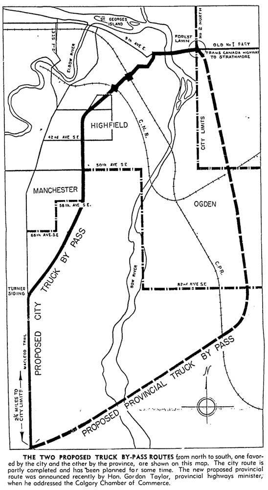 Though Calgary’s mayor, Don Mackay, was in favour of a bypass road, he felt that the Province’s planned road was located too far out of the city to have any immediate benefits to the residents and businesses of southeast Calgary. Mackay instead favoured a road that the City had already had begun building; one which was poised to serve the City’s growing industrial areas. The City’s road originated at the same location as the Provincial proposal and headed along the present Blackfoot trail to Glenmore trail, where the City wanted the Province to extend the road in a southwesterly direction to Macleod trail at Heritage Drive.