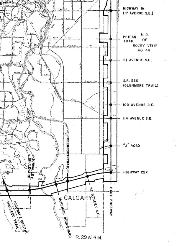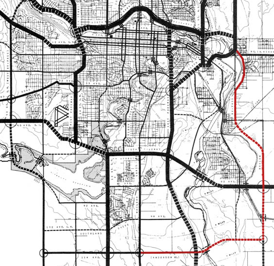 In the east, the plans retained the City’s Blackfoot trail route as part of the intermediate ring. The Province’s route meanwhile would be modified and integrated into the second stage of the bypass network, the outer ring, which would provide a true highway bypass around the city. The modified Provincial road was straightened, and pushed further east than previously noted; it now began at the intersection of 17th avenue SE and 52nd street SE, where it headed south to the CN train tracks. The road followed the tracks in a south-westerly direction to the 32nd street SE/Barlow trail corridor, where it headed south to 114th avenue/Anderson Road. From there the road headed east across the Bow river to connect with Macleod trail.