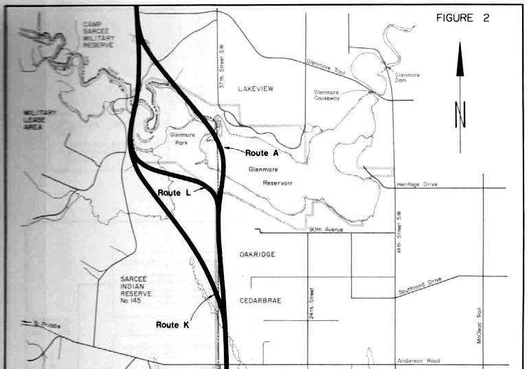 When the City’s 1977 study concluded with two of the three routes proposed through the reserve (Routes K and L above), it was noted that further refinement of the options would have to wait until the Tsuut’ina routes could be more fully evaluated. The study could not select a single alignment for the road as there were too many unknowns regarding the routes located on the reserve, including if the acquisition of the land would even be possible at all. In order to facilitate the involvement needed from the Nation to proceed, the Calgary City Council approved $40,000 to be put towards a joint study of the road, but while the Tsuut’ina hired legal council to represent their interests and draft terms of reference for negotiations, a fully independent study was never undertaken.