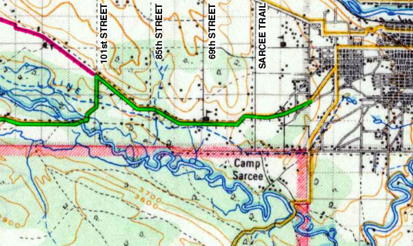 Sarcee_corridor(Shown are the locations of the original west leg of the ring road along the Sarcee trail corridor, and the new West leg on 101st street SW, plus the missing portion between the two routes along the Highway 8 corridor.10)