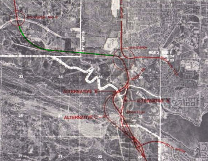 When originally planned, the West portion of the ring road was planned along the Sarcee trail corridor south of the Bow river, and did not utilize the Highway 8 corridor. This changed when the plans for the Northwest ring road were altered in the mid 1970s, and its route was shifted west to the 101st street corridor. With a new Northwest ring road alignment came the need for a new West leg of the road, as well as a way to connect that leg to the previously planned Southwest ring road route.