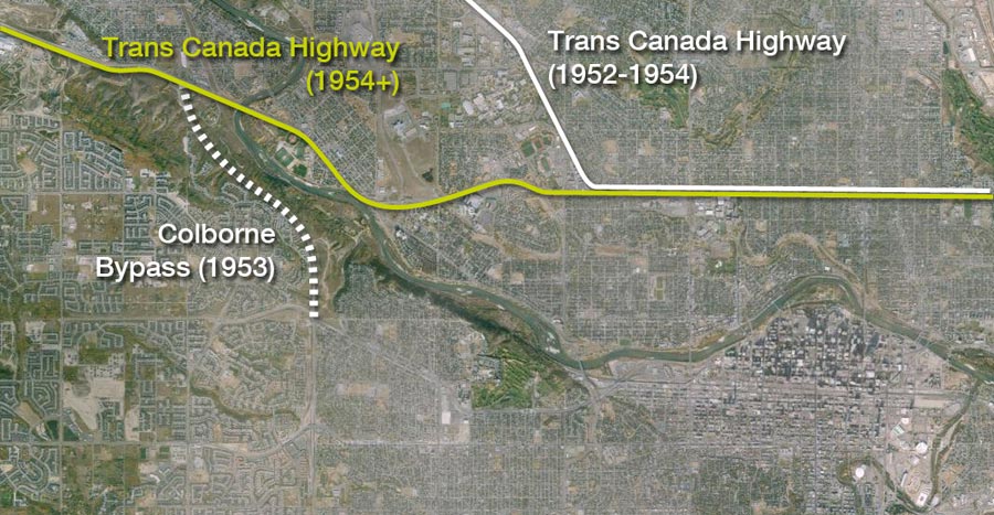At the time of the rejection of Colbourne’s bypass request, Minister Taylor noted that the road would not connect with any major highway, and was thus a matter for the local municipal district to undertake if required. Though the Trans Canada Highway currently runs through Bowness, in the early 1950s the highway was instead planned to exit the city along Banff Trail (now Crowchild Trail NW). In July of 1954, however, the Province announced that a new westward path for the highway had been selected, and the proposed route would now head through Bowness near the Shouldice bridge, exactly where Colborne’s bypass would have been located.8