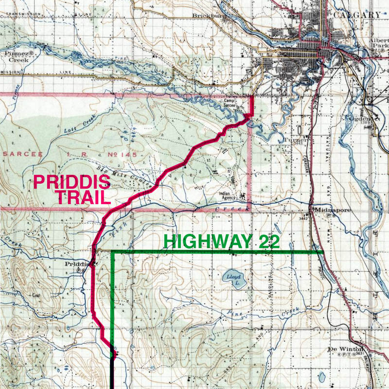 1926-pt(The route of the Priddis Trail (magenta) between Calgary and Millarville through the Tsuut’ina Reserve (outlined in light-pink). Source: Topographical Survey of Canada, Department of the Interior. Calgary District, Alberta. Ottawa: Department of the Interior, 1926. Peel’s Prairie Provinces Archives, University of Alberta. Map 17. Highlight added.)