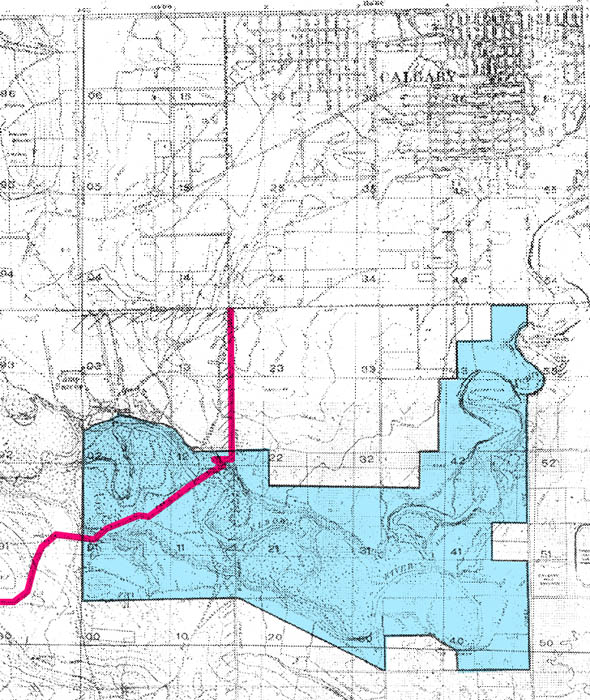 In 1929 the City of Calgary had approved the construction of the Glenmore dam on the Elbow river in order to flood the Elbow valley and create a new reservoir for the city. The Priddis Trail crossed the Elbow river by way of the Weasel Head Bridge located at the west end of the proposed Glenmore reservoir, but the extent of the flooding at the west-end of the reservoir, the Weaselhead area, was apparently not well understood by all involved.
