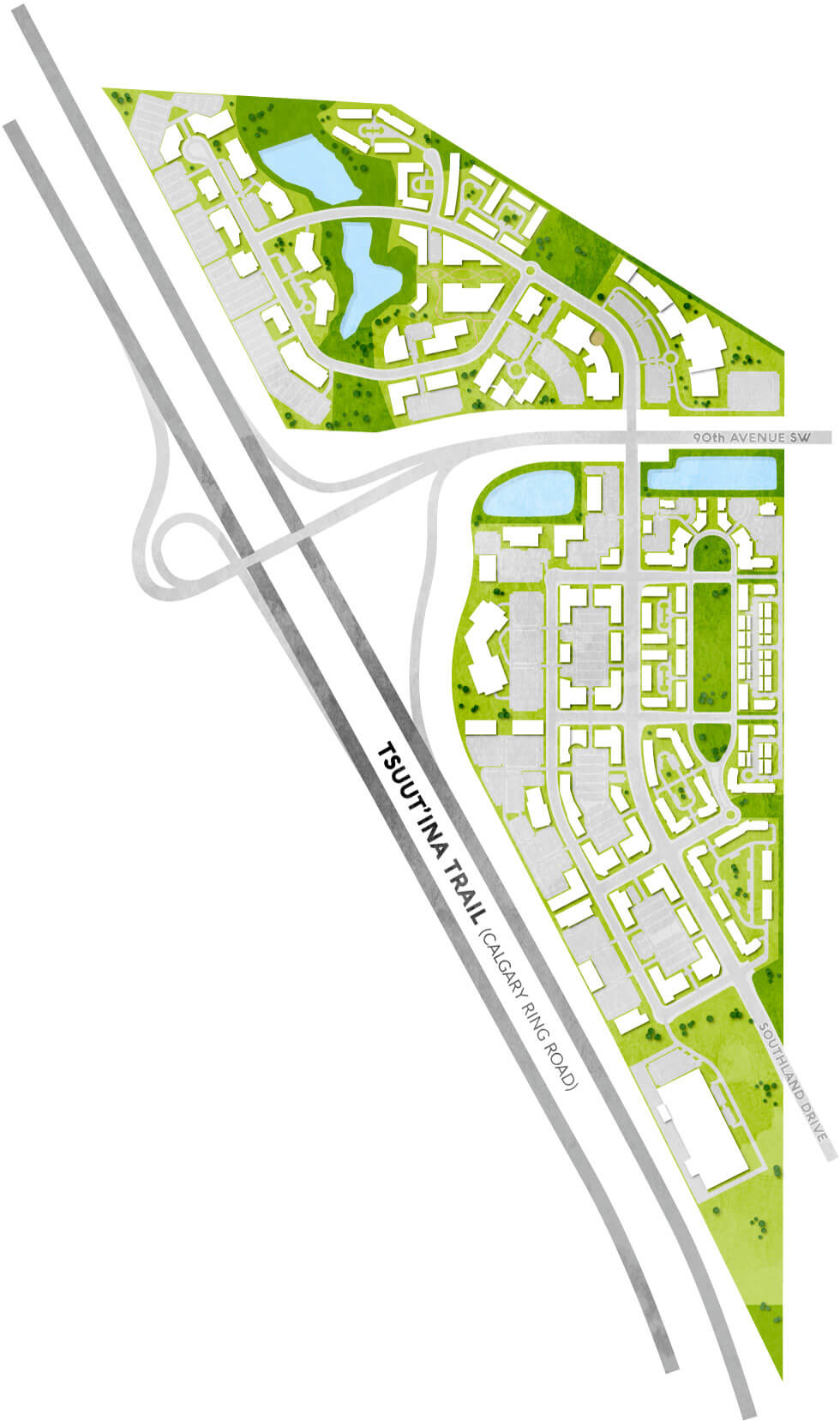 Taza Crossing is a 360-acre development located to the south of the Glenmore Reservoir and is bounded by Tsuut’ina Trail to the west, and by the community of Oakridge to the east. Access is provided by an interchange on the ring road at the new extension of 90th avenue SW, which will be intersected by an extension of Southland drive.