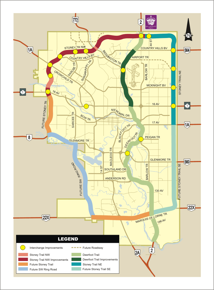 The ring road was not intended to be built when these plans were being developed, and was viewed as something that would be needed in a 30-year time-frame at earliest. A portion of the ring road was first approved to be built in the early 1980s, but an economic recession put those plans on hold. The first leg of the road, in Calgary’s northwest quadrant, would not see construction until 1995 (See The Ring Road System – Implementation for more information).