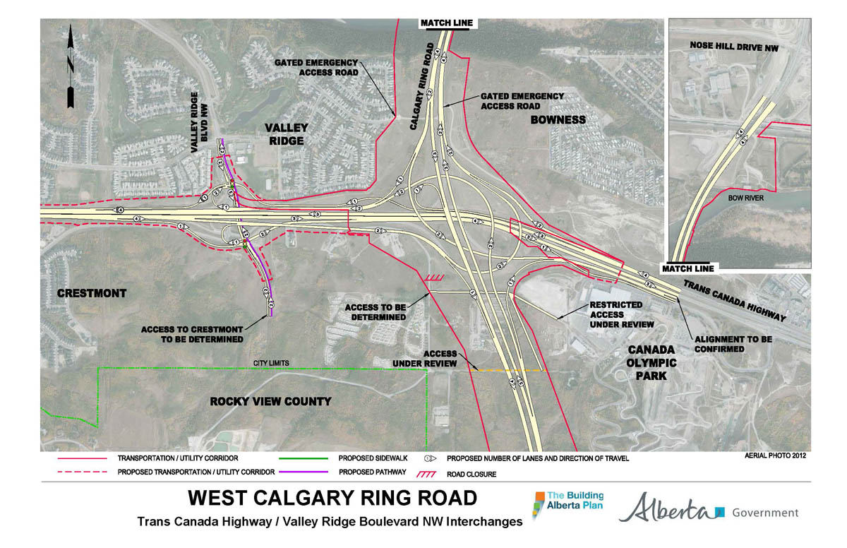 In 2013 the Province of Alberta and the Tsuut’ina Nation entered into an agreement to sell land for the Southwest Calgary Ring Road. This agreement guaranteed access to the Tsuut’ina Nation reserve at 37 Street SW and Glenmore Trail as part of the ring road project. If this access is not provided, the ownership of the entire ring road corridor through the reserve will revert back to the Nation. The design of the new permanent interchange is shown below.